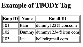 <!DOCTYPE html> <html> <head> <title>HTML TBODY Tag</title> </head> <body> <h2>Example of TBODY Tag</h2> <table border="1"> <thead> <tr> <th>Emp ID</th> <th>Name</th> <th>Email ID</th> </tr> </thead> <tbody> <tr> <td>101</td> <td>Ram</td> <td>dummy123@icon.com</td> </tr> <tr> <td>102</td> <td>Dummy</td> <td>dummy1234@icon.com</td> </tr> <tr> <td>103</td> <td>Jai</td> <td>hello@gmail.com</td> </tr> </tbody> </table> </html>